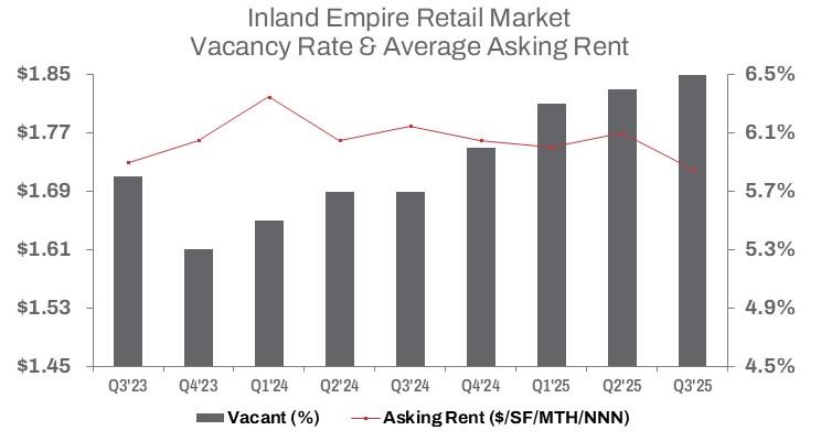Inland Empire’s retail sector showed signs of increased pressure through the third quarter of 2025. While market fundamentals such as new supply and solid regional demographics remain intact, the regional retail landscape began to reflect persistent macroeconomic uncertainty and its impact on major retailers. The market closed the quarter with a slight increase in vacancy, driven by both new construction deliveries and store closures.