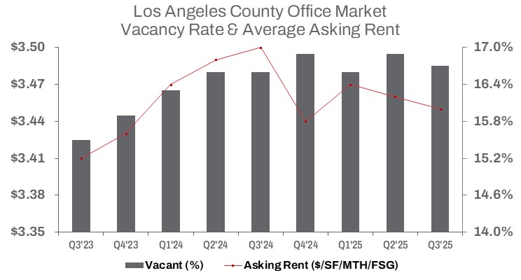 The L.A. County office market’s recovery remains constrained by weak demand, newly completed space sitting idle, and persistent vacancy. Landlords are hesitant to adjust asking rents despite elevated availability, limiting leasing momentum. As of Q3, 30.5% of office construction delivered since 2020 remains unoccupied.