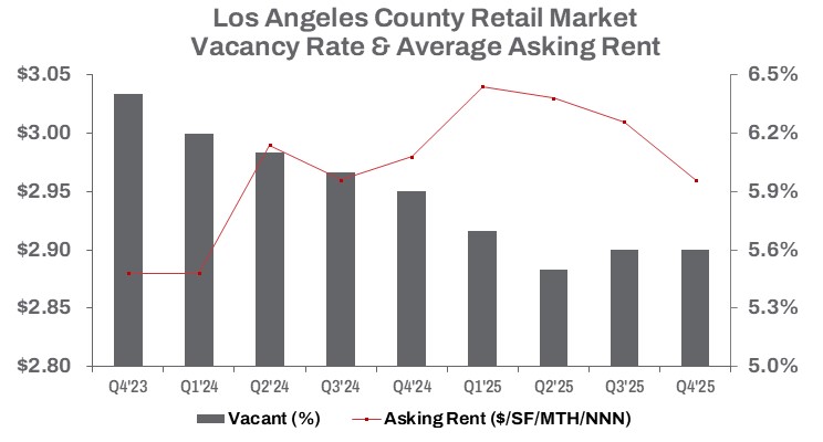 Los Angeles County’s retail market closed 2025 with mixed yet generally stabilizing conditions. Steady consumer activity supported demand for space, but elevated operating costs and retailer bankruptcies continued to challenge landlords. Even so, excess inventory is gradually being absorbed and occupancy posted modest quarterly gains.