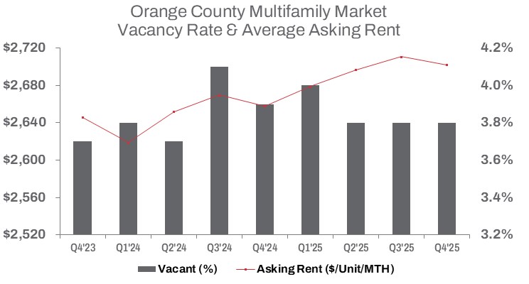 In Q4 2025, Orange County’s multifamily market showed clear signs of adjustment. Vacant units inched up 0.1% quarter-over-quarter to 11,926 but declined 1.6% year-over-year, reflecting a gradual easing in supply pressure. Developers delivered just 430 new units during the quarter, a 26.2% drop from Q3 2025, bringing year-to-date deliveries down 43.1% to 1,979 units. This slowdown reflects tighter financing conditions and a more cautious development posture as builders respond to mixed demand signals.