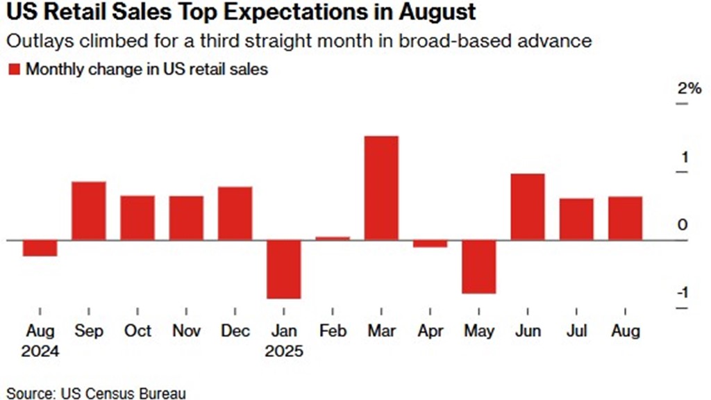 U.S. retail sales rose 0.6% in August, triple the 0.2% forecast, with core sales (excluding autos and gas) up 0.7%. Year-over-year growth reached 5%, signaling consumer strength despite a slowing job market and higher inflation.
